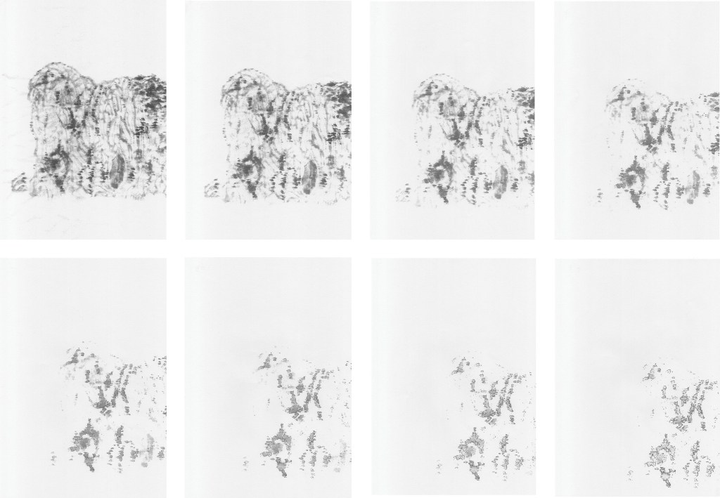 The repeated photocopying emphasizes the change in materiality. The image undergoes transformation, distortion, and a loss of detail with each reproduction, highlighting the subtle yet inevitable shifts that occur over time.
